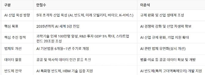 안철수 후보와 이준석 후보는 “AI는 복지 수단이 아니라 국가 기술 경쟁력 그 자체”라고 반박한다. 두 후보는 글로벌 AI 패권 경쟁에서 살아남기 위해서는 “속도와 혁신이 관건”이라는 점에서는 인식을 같이한다.