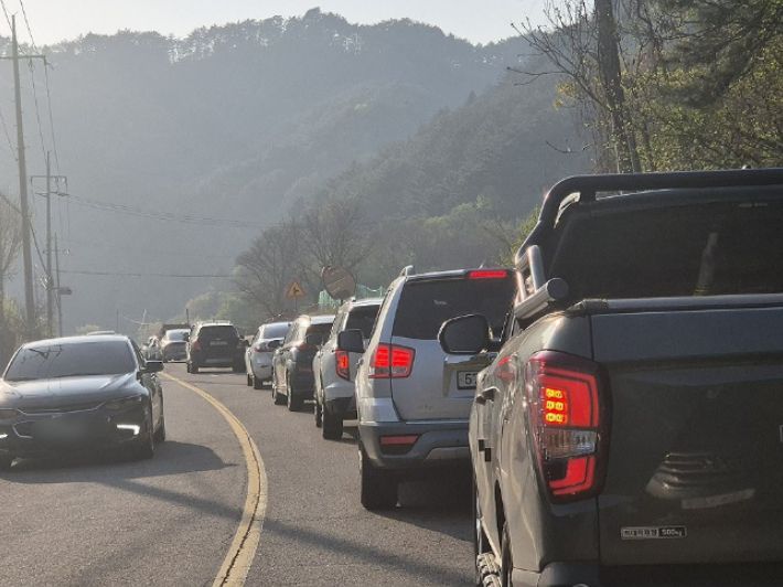 26일 오후 강원 인제군 상남면 한 야산에서 발생한 산불로 인근 도로에 극심한 차량 정체가 이어지고 있다. 연합뉴스 |
