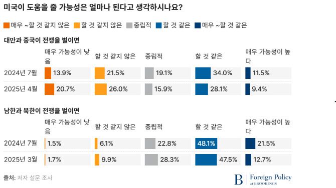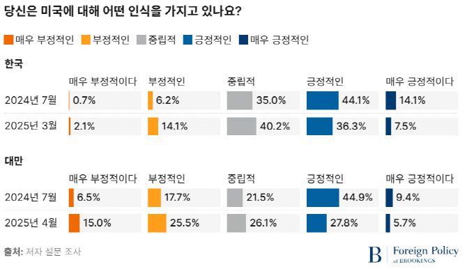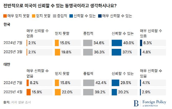 브루킹스 연구소는 25일(현지시간) 지난 2월부터 4월까지 한국과 대만 유권자 2000명을 대상으로 한 설문조사 결과를 발표했다. 이 설문조사는 미국 대선 기간이었던 2024년 7월 한국과 대만 유권자 1500명을 대상으로 미국, 미국의 리더십, 미국을 신뢰할 수 있는 파트너로 생각하는지에 대한 일련의 질문을 담은 설문조사서 트럼프 대통령에 대한 질문을 추가한 것이다.