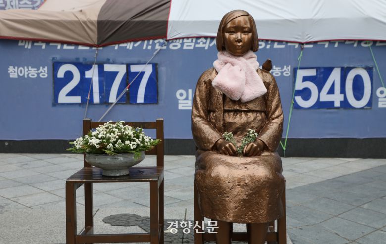 서울 종로구 옛 일본대사관 앞에 지난해 11월14일 건립 10주년을 맞은 평화의 소녀상에 목도리가 둘러져 있다. 한수빈 기자 |