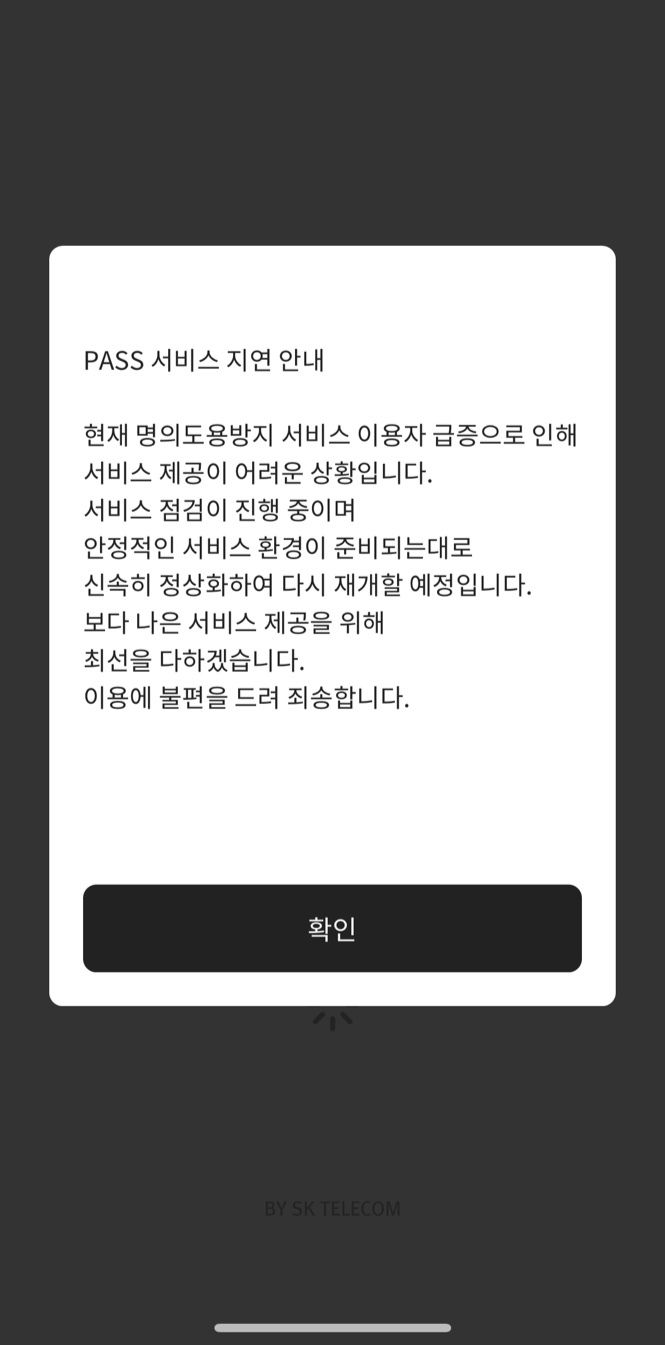 [서울=뉴스핌] 정승원 기자 = 본인인증서비스(PASS)의 '명의도용방지' 서비스 기능이 먹통이 되면서 소셜미디어에서는 우회 가입팁까지 나오는 등 혼란이 커지고 있다.