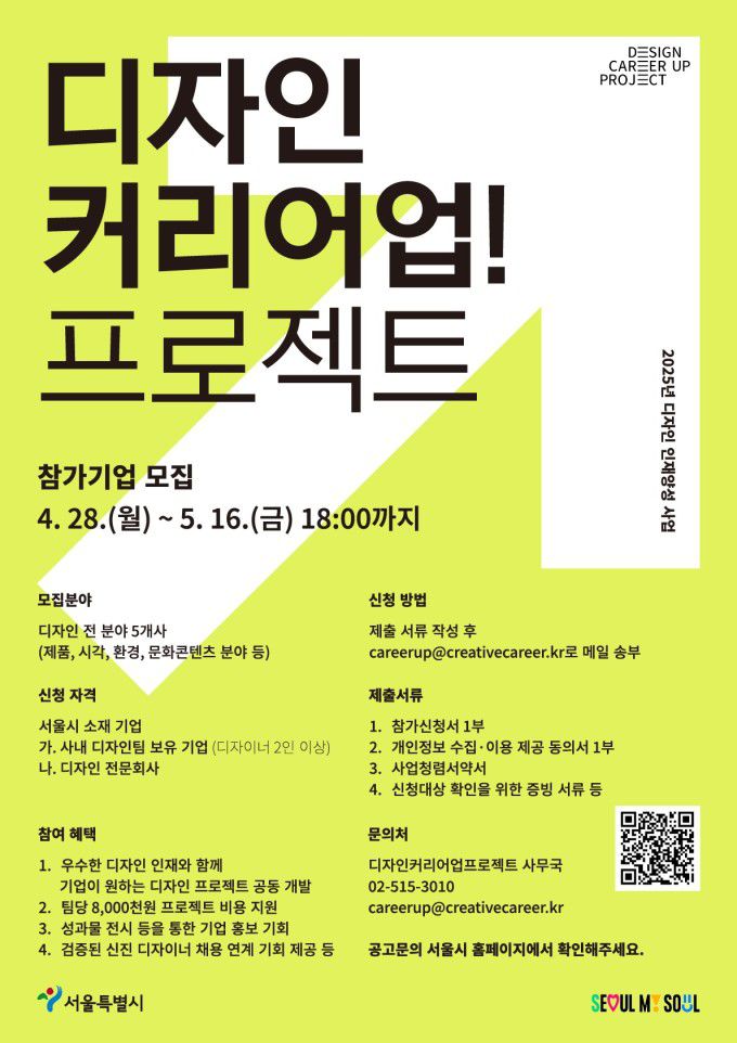 또 이 사업은 기업의 유망 인재 발굴·채용 연계 가능성을 높이며 서울 내 디자인 생태계와 산업 경쟁력 강화에 기여할 것으로 전망되고 있다. 모집 대상 기업은 서울에 본사를 둔 사내 디자인팀(디자이너 2인 이상)을 보유한 기업이나 산업디자인·공공디자인 전문회사로, 신진 디자이너를 멘토링할 의지가 있는 곳이라면 누구나 참여 가능하다.