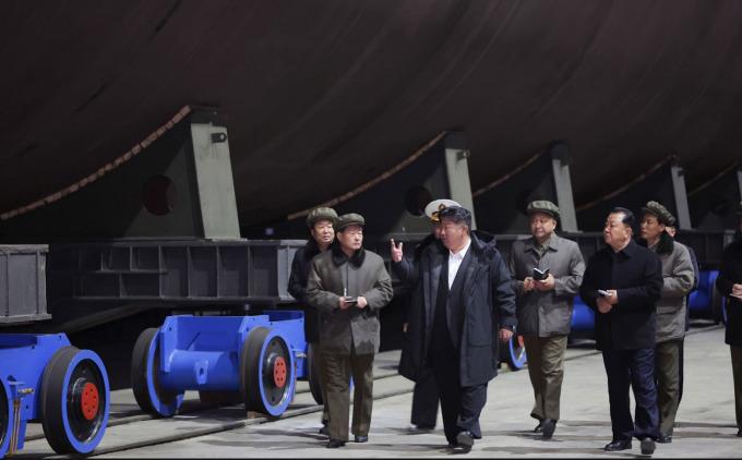 [서울=뉴스핌] 이영종 통일전문기자 = 김정은 북한 국무위원장이 지난 3월 초 선박 건조 현장을 돌아보는 모습. 김정은 뒤편으로 잠수함으로 추정되는 선체가 드러나는데, 북한 선전매체들은 3월 8일 보도에서 "노동당 제8차 대회(2021년 1월) 결정에 따라 추진되고 있는 핵 동력 전략 유도탄 잠수함 건조실태도 현지에서 요해했다"고 전했다. [사진=화보 조선] 2025.11.17 yjlee@newspim.com |