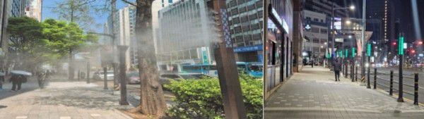 낮시간대 물안개 분사 모습과 일몰 이후 LED 조명 발광 모습/제공=중구청 |