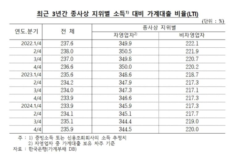 자영업자의 LTI는 지난 2022년 4·4분기 말 350.0%로 고점을 찍은 뒤 지난해 3·4분기 말 344.4%까지 7분기 연속 하락세를 이어왔다. 그러다 지난해 4·4분기에 2년 만에 상승세로 돌아섰다.
