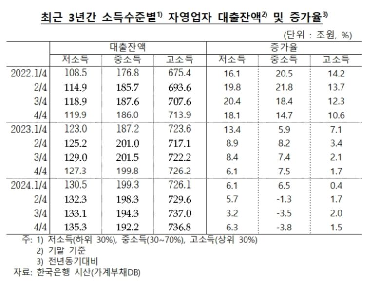고소득 자영업자 대출 잔액은 지난해 3·4분기 말 737조원에서 4·4분기 말 736조8000억원으로, 중소득 자영업자 대출 잔액은 194조3000억원에서 192조2000억원으로 각각 줄었다.