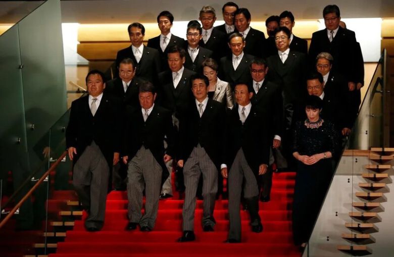 고 아베 신조 일본 총리(앞줄 왼쪽 셋째) 지난 2019년 각료들과 연미복을 입고 총리 관저에서 기념사진을 찍고 있다. 도쿄/로이터 연합뉴스 |