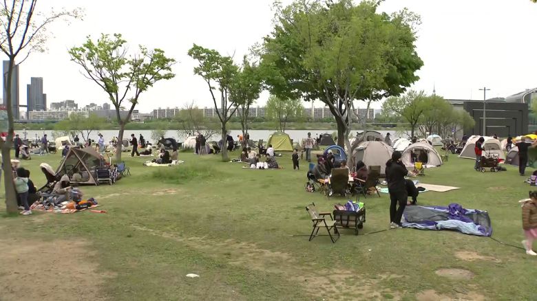텐트에서 휴식을 취하거나 산책을 하며 각자의 방법으로 봄을 즐기고 있습니다.