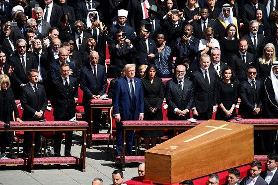 (왼쪽부터)도널드 트럼프 미국 대통령과 그의 부인 멜라니아 트럼프 여사, 펠리페 6세 스페인 국왕이 26일(현지시간) 바티칸에서 열린 프란치스코 교황의 장례 미사에 참석했다. 로이터=연합뉴스 |
