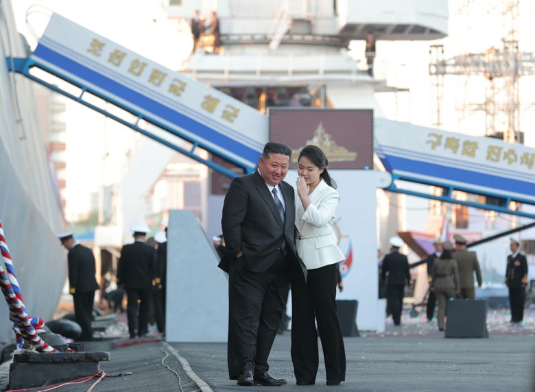 북한 김정은 국무위원장과 딸 김주애가 지난 25일 남포조선소에서 열린 5,000t급 신형다목적구축함 ‘최현호’ 진수식에 참석해 있다. 노동신문 뉴스1 |