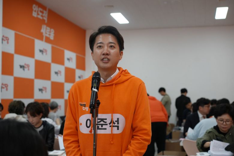 이준석 개혁신당 대선 후보가 27일 서울 강남 캠프에서 홍보물 봉입 행사를 진행하고 있다. |