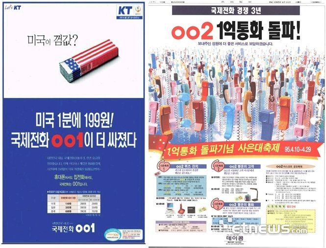 2002년 미국 국제전화 광고(옛 한국통신·왼쪽)와 1995년 국제전화시장 경쟁(옛 데이콤) 광고. |