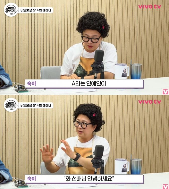 김숙은 "A라는 연예인이 있다. 앞에서는 '와 선배님 안녕하세요'라고 다 인사하고 차 문을 닫으면 본성이 나온다"고 밝혔다.