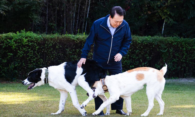 지난 2024년 11월 10일 윤석열 당시 대통령이 서울 한남동 관저에서 중앙아시아 순방 중 선물로 받은 쿠르크메니스탄 국견 알라바이 ‘해피’와 ‘조이’를 산책시키는 모습. 대통령실 제공 |