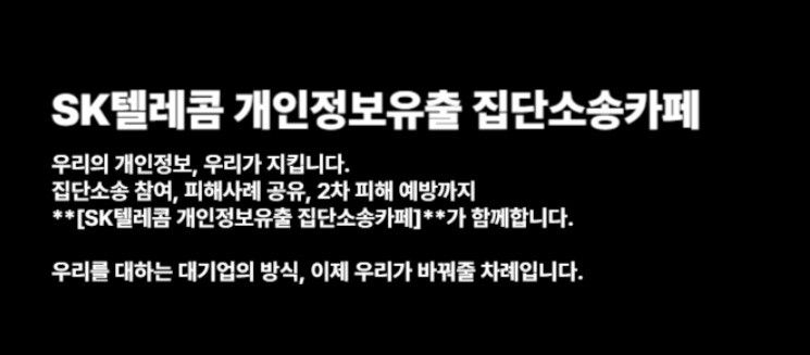 이들은 “SK텔레콤은 유출 사실을 인지한 후 악성코드를 삭제하고 해킹 의심 장비를 격리 조치했지만, 정확한 유출 규모와 피해 범위는 아직 파악되지 않았다”며 “정부와 관계 당국은 비상대책반을 구성하고 전면적인 조사를 진행 중이지만 피해자들은 여전히 불안에 떨고 있다”고 주장했다. 이어 “이제, 우리 스스로 나서야 할 때”라며 “‘SK텔레콤 개인정보유출 집단소송 카페’는 피해자들이 함께 모여 정보를 공유하고 집단소송을 통해 권리를 되찾기 위한 공간”이라고 소개했다. 이 카페의 공지글을 보면 “법무법인을 선정 중”이며 “집단소송에 참여 의사 접수”를 받는 과정이다.