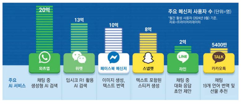국내 대표 메신저 카카오톡의 변화도 주목된다. 오픈AI와 전략적 제휴를 맺은 카카오는 오픈AI 기술을 기반으로 카카오톡에 생성형 AI 기능을 도입할 계획이다. 아직 구체적인 기능 형태는 공개되지 않았지만, 경쟁 메신저들과의 차별화를 위해 '단체 채팅에 자연스럽게 스며드는 AI'를 핵심 전략으로 내세울 것으로 알려졌다.