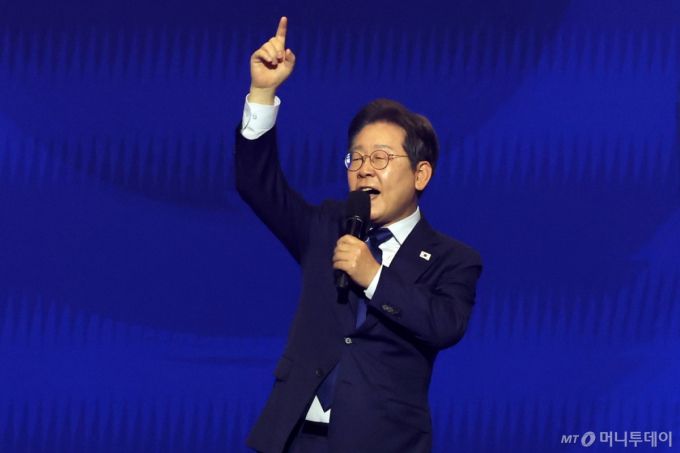 더불어민주당 제21대 대통령 선거 후보에 선출된 이재명 후보가 27일 경기도 고양시 킨텍스에서 열린 제21대 대통령 선거 후보자 선출을 위한 수도권·강원·제주 합동연설회에서 수락연설을 하고 있다. 2025.04.27. /사진=뉴시스 /사진=조성우 |