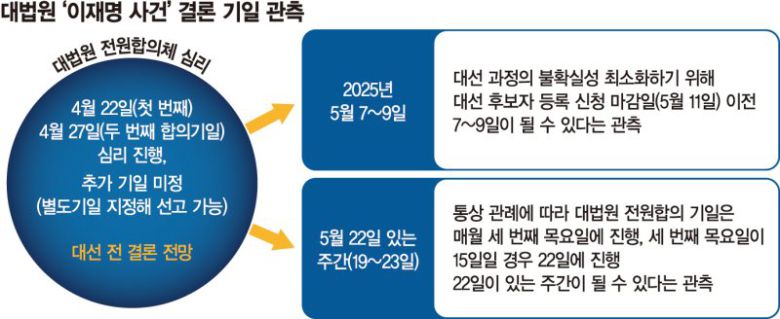 대법원 내규를 보면 전합 기일은 한 달에 한 번 매월 세 번째 목요일에 진행하는 것을 원칙으로 한다. 다만 세 번째 목요일이 15일일 경우 한 주 미뤄 22일 진행한다. 내규상 선고 기일을 전합 기일과 다른 날로 지정할 수 있지만, 통상 그날 합의뿐 아니라 선고도 같이한다. 이때 선고 사건은 전달 합의된 사안들이다. 전합 70∼80%의 사건은 대부분 한 번의 합의로 끝나고 판결문 작성에 들어가 다음 달 선고된다. 실제 최근 1년간 전합 사건은 모두 해당 월의 세 번째 또는 네 번째 목요일에 선고됐다. 아직 한두 차례 더 합의가 필요하고, 판결문 작성에 걸리는 시간을 고려할 경우 5월 다섯째 주까지 밀릴 수 있다. 다만 이렇게 되면 대선 직전이고, 선거에 미칠 파장이 상당할 것이라는 점에서 대법원이 정치적 논란의 중심에 설 가능성도 배제할 수 없다.