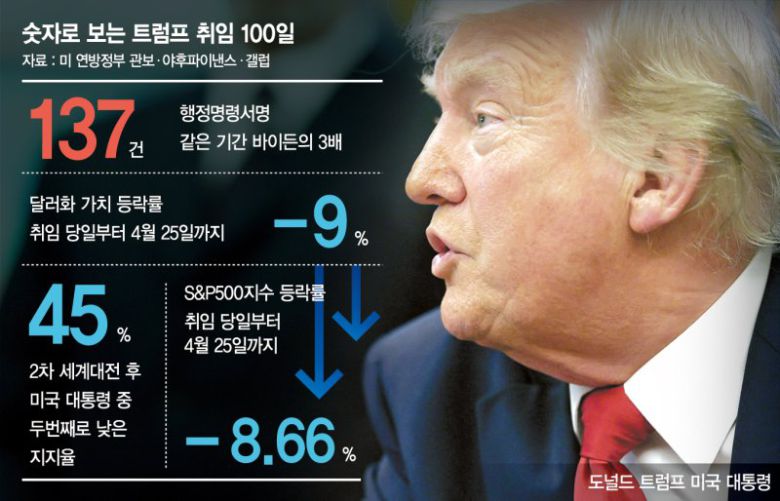전통적인 안전 자산인 달러화 역시 트럼프의 관세 정책 후 약세로 돌아섰다. 25일(현지시간) 기준 유로화와 일본 엔화 등 주요 6개 통화 대비 달러화 가치를 반영한 달러화 인덱스(DXY)는 트럼프 대통령이 취임했던 지난 1월 20일 이후 9% 정도 하락했다.