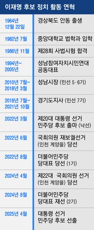 중학교도 다니지 못한 소년공이 변호사, 시장, 도지사를 거쳐 기호 1번 대권 후보로 두 번째 선출되는 정치 신화를 썼다. 27일 더불어민주당의 6·3 조기 대선 후보로 확정된 이재명 후보의 드라마틱한 역정이다.