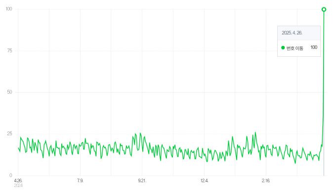 27일 포털 네이버의 통계 데이터(데이터랩)에 따르면, '번호 이동' 검색량이 전날을 기점으로 급격히 치솟으며 최근 1년 중 최고치(지수 100)를 기록했다. 그래프의 수치는 최근 1년간 해당 키워드가 포털에서 검색된 횟수 중 가장 많은 날을 100으로 환산한 상대적 지수다. 평소 10~20대에 머물던 검색 지수가 지난 26일 하루 만에 정점을 찍음으로써 SK텔레콤 해킹 사태 이후 번호 이동에 대한 관심이 급증했다는 진단이 나왔다.