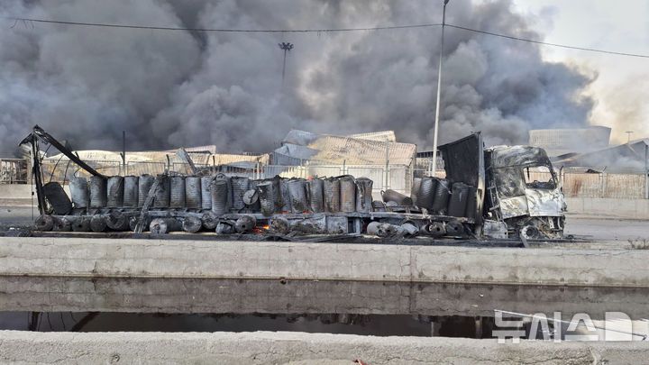 [AP/뉴시스] 26일 이란 남부 항구도시 반다르 아바스 인근 항구에서 큰 폭발 화재가 터진 뒤 27일 불 탄 트럭 뒤편에서 검은 연기가 솟아오르고 있다 |