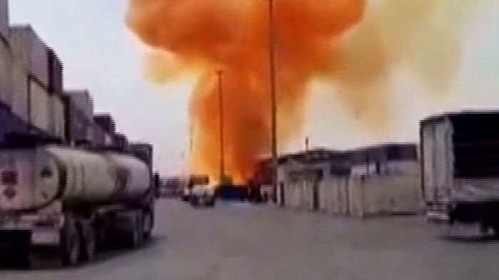 큰 진동과 함께 창고 건물에서 검은 연기가 뿜어져 나옵니다.