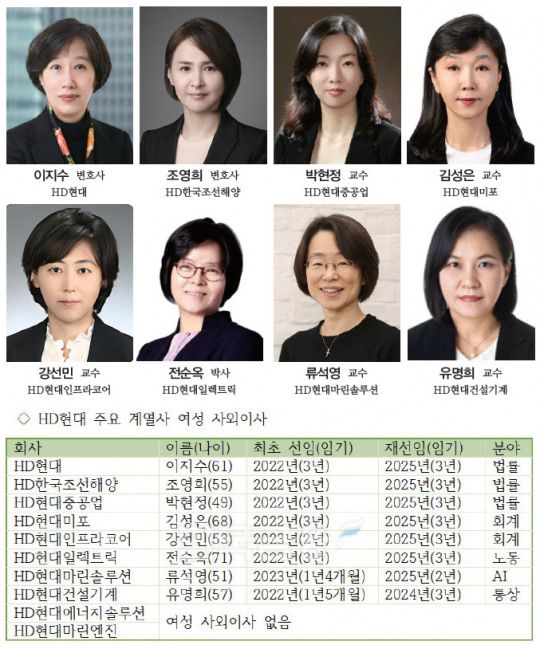 27일 재계에 따르면 HD현대, HD한국조선해양, HD현대중공업, HD현대미포, HD현대인프라코어, HD현대일렉트릭, HD현대마린솔루션 등 HD현대그룹 회사들은 지난달 개최한 2025년 정기주주총회에서 사외이사 1명씩을 재선임했다. 공교롭게도 이들 모두 여성 사외이사로 2, 3년 전 HD현대그룹과 인연을 맺었다. 법률, 회계, 노동, AI(인공지능) 전문가다.