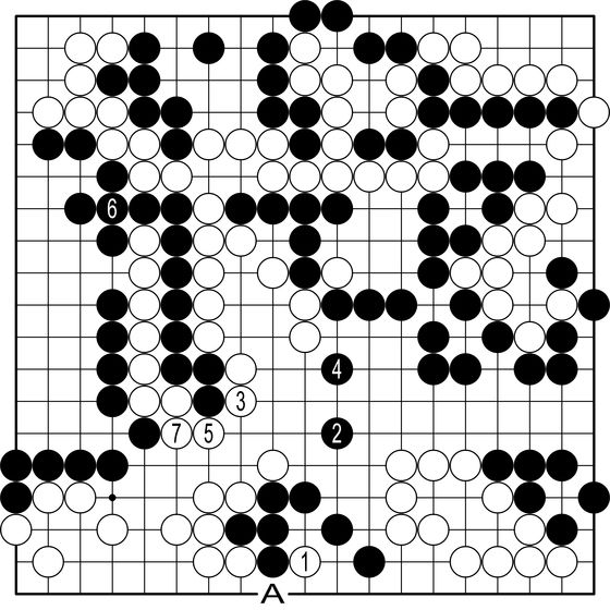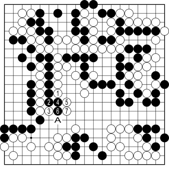 ◆AI의 수순=AI는 백1의 치중이 한발 먼저라고 말한다. 백1이 놓이면 두 집이 없는 흑은 2로 달아나야 한다. 그때 백3으로 막고 흑4로 재차 달아나면 백5, 7로 중앙을 틀어막는다. 이 그림은 백A의 이득을 남긴 만큼 백이 벌었다. 이랬으면 백이 1집반 우세했다.