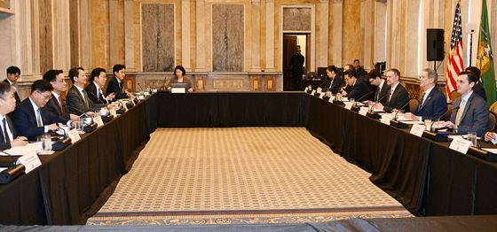 최상목 경제부총리 겸 기획재정부 장관과 안덕근 산업통상자원부 장관(왼쪽 첫째와 둘째)이 24일(현지시간) 미국 워성턴DC 재무부에서 열린 ‘한-미 2+2 통상협의(Trade Consultation)’에서 스콧 베센트 미국재무장관, 제이미슨 그리어 미국무역대표부(USTR) 대표와 회의를 하고 있다. [뉴시스]