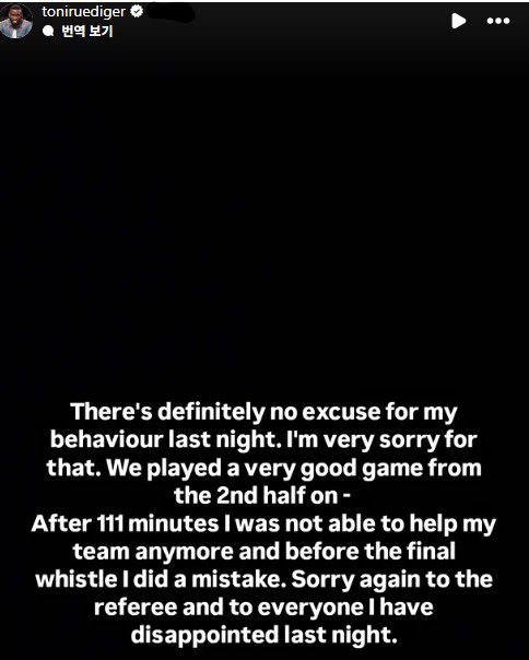 뤼디거가 자신의 행동에 대한 사과문을 올렸다.