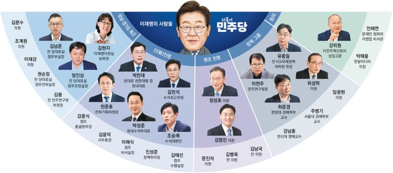 당내에서도 원외 비주류로 꼽히던 이 후보는 당 대표와 대선 경선 시기별로 당내 이해찬계와 민주평화국민연대(민평련), 박원순계, 친문(친문재인)계 의원을 흡수하면서 측근 그룹을 확장해 왔다. 특히 이 후보는 과거 경력이나 출신보다는 능력을 최우선 원칙으로 삼는다는 평가다. 이 후보는 지난해 총선 압승과 당 대표 연임 과정에서 당이 친명계 일색으로 정리된 뒤엔 “2인자는 없다”는 방침 아래 현역 의원 및 원외 전문가들 간 철저한 경쟁을 유도하고 있다.