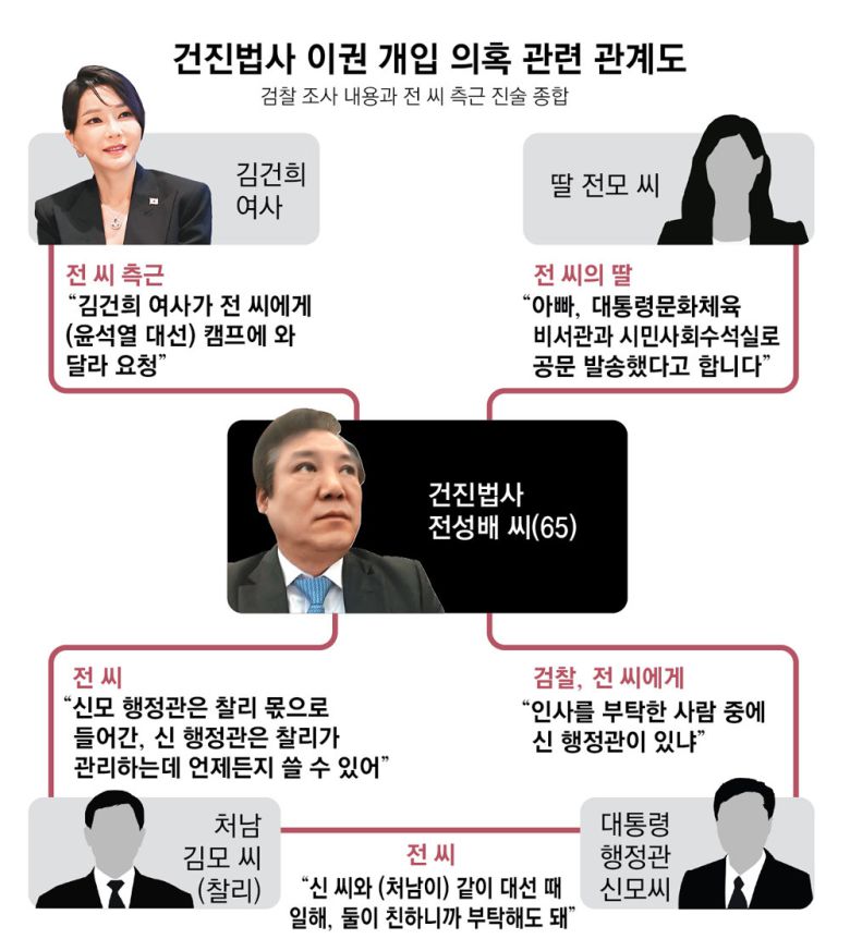 검찰은 이 같은 문자 내역을 바탕으로 전 씨와 김 씨가 인사 청탁 등을 통해 이권에 개입한 것으로 보고 있다. 검찰 조사에서 전 씨는 신 행정관과 아는 사이라는 점을 인정하기도 했다. 전 씨는 “신 씨는 아는 사람은 맞는데 부탁한 건 없다”고 밝혔다. 그러면서 “신 씨와 김 씨가 대선 때 일을 했다. 그래서 둘이 친하니까 둘이 잘 통하니까 언제든지 삼촌(신 씨)한테 부탁해도 된다는 뜻”이라고 했다. 신 행정관은 2022년 대통령 선거 직후 대통령실에서 근무를 시작했다. 복수의 정치권 관계자에 따르면 대통령실은 신 행정관을 조만간 있을 승진 대상에 포함시킨 것으로 전해졌다.