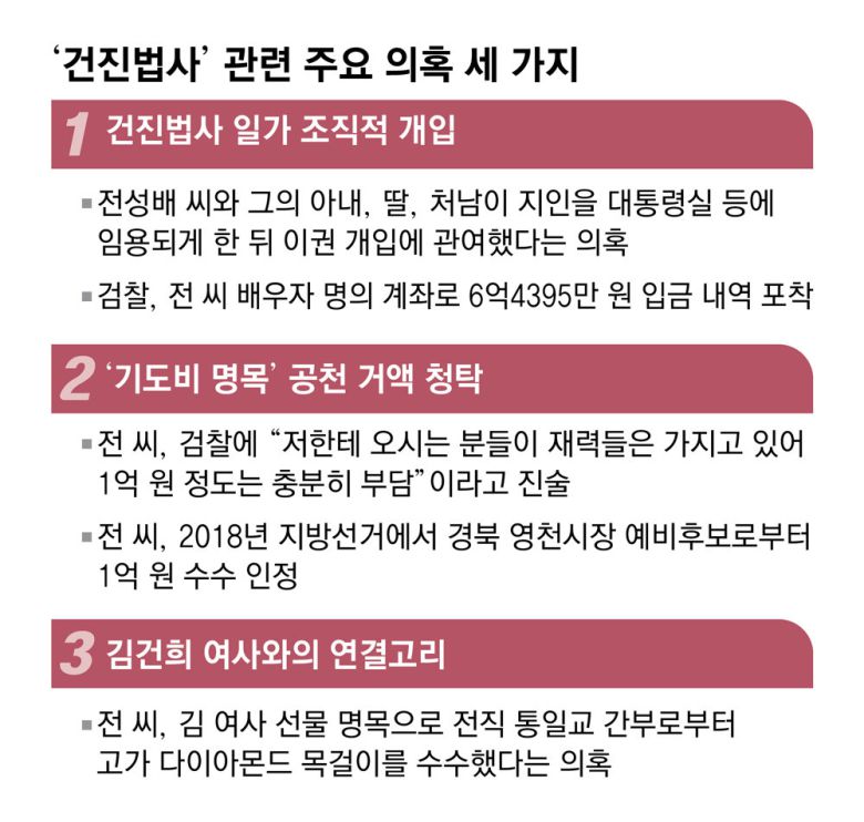 검찰은 전 씨의 금품 수수 정황까지 들여다보고 있다. 전 씨가 통일교 전 고위 간부로부터 김 여사에게 전달할 선물 명목으로 고가의 다이아몬드 목걸이를 수수한 정황도 포착했다. 검찰은 해당 목걸이의 행방을 추적하고 있다.