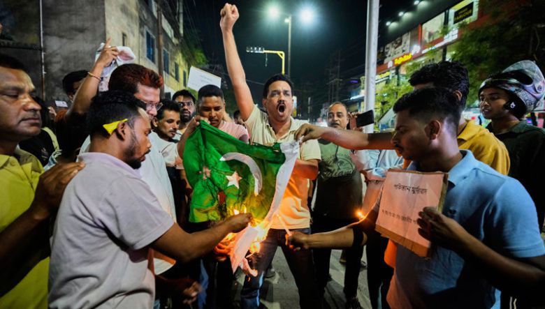 23일 인도 북동부 가우하티 주민들이 하루 전 카슈미르에서 무장 괴한의 총격 테러로 인도인들이 대거 숨진 사건에 항의하며 파키스탄 국기를 불태우고 있다. 나렌드라 모디 인도 정권은 이번 테러의 배후에 파키스탄이 있다고 주장하고 있다. 가우하티=AP 뉴시스 |