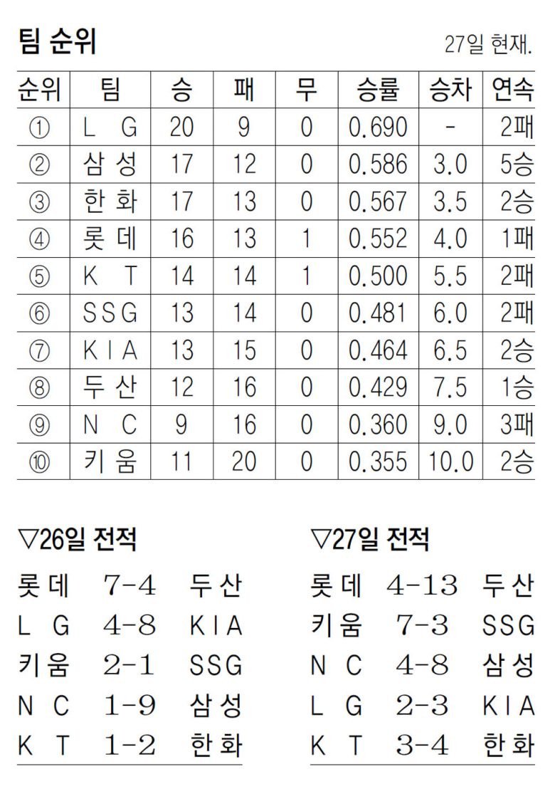 삼성은 NC와의 안방경기에서 2홈런을 친 외국인 선수 디아즈의 방망이를 앞세워 8-4로 승리했다. NC와의 주말 3연전에서만 5개의 홈런을 몰아 친 디아즈(11개)는 KIA 위즈덤과 한화 노시환(이상 9개)을 제치고 홈런 단독 선두로 치고 나갔다. 5연승을 달린 2위 삼성은 선두 LG를 3경기 차로 추격했다.