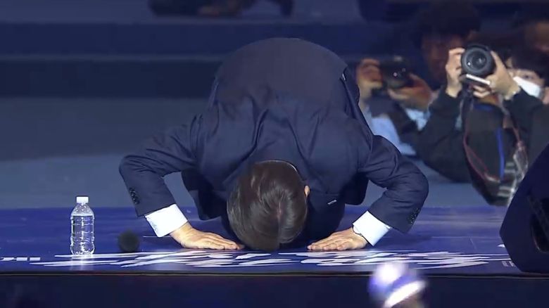 수락연설에서 '통합'을 모두 14번 외친 뒤 넙죽 큰 절을 올린 이재명 후보.