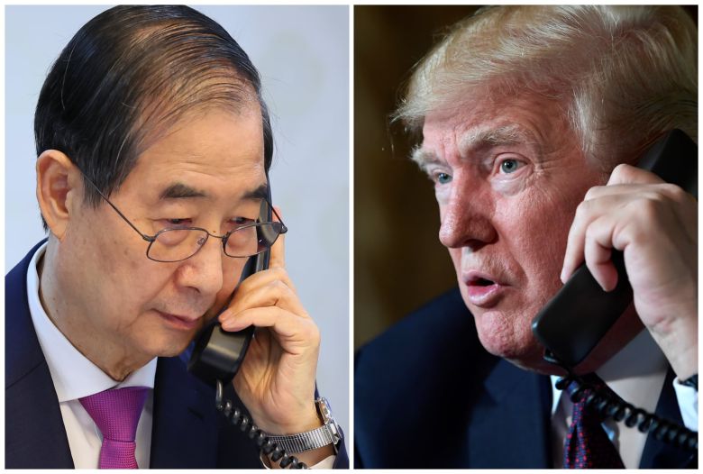 한덕수 대통령 권한대행 국무총리는 지난 8일 정부서울청사 집무실에서 도널드 트럼프 미국 대통령과 통화했다(왼쪽 사진). 지난 1월 트럼프 대통령 취임 이후 한미 정상 간 직접 소통은 이번이 처음이다. 통화는 28분간 이뤄졌다고 총리실은 밝혔다. 오른쪽은 2018년 11월 플로리다 마러라고에서 군과 통화하는 트럼프 대통령./총리실·AP 연합뉴스
