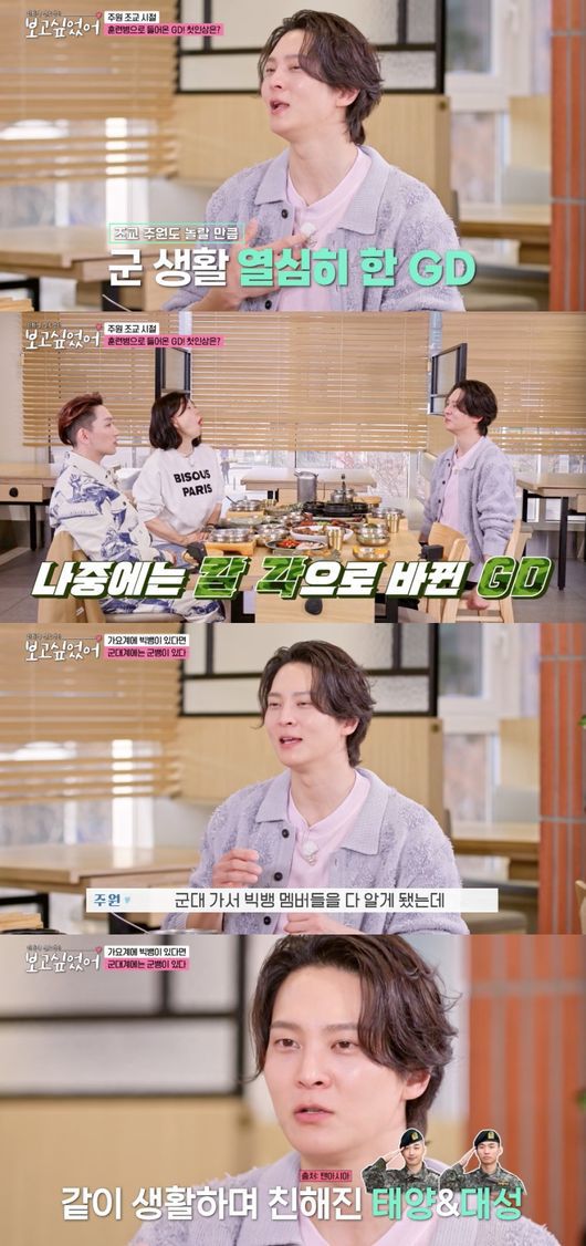 또 주원이 조교로 있을 당시 지드래곤이 훈련병으로 들어왔었다고. 이에 주원은 “그때 지용이가 들어왔다. 지용이가 와서 하는데 진짜 열심히 했다. 나도 그래서 놀랐다”라고 회상했다.