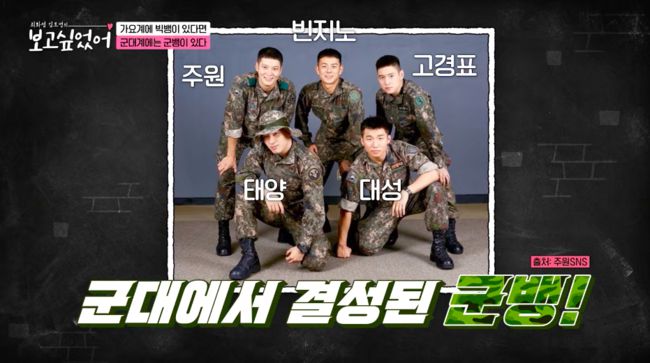 여전히 군뱅 멤버들과 연락을 하고 지낸다는 주원은 “얼마 전에 예비군을 갔는데 너무 심심하더라. 출퇴근으로 갔다. 애들 없나 그래서 연락했다. ‘오늘 오는 사람 없냐’ 물었더니 태양이가 ‘형 저 여기 있어요. 맨앞 줄에 있다’고 하더라. 태양이랑 하루종일 같이 하면서 수다 떨고 했다”라고 우정을 과시했다.