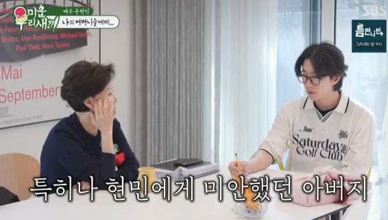 이어 윤현민은 자연스럽게 3년 전 지병으로 세상을 떠난 부친에 대한 이야기를 꺼냈다. 납골당을 찾기 위한 준비 과정에서 제사 이야기가 나오자 모친은 “거기서 제사 하냐?”, “그 어머니에게도 금일봉 드려야지”라고 말하며, 새어머니를 ‘어머니’라 부르는 윤현민의 태도에 담담한 반응을 보였다. 그는 “어머니 만나 식사할 예정”이라며 새어머니에 대한 애정을 드러냈다.