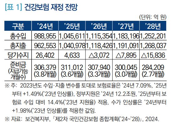 국회입법조사처는 “보험료율, 국고지원, 사회보장분담금 도입 등 재원 확보 관련 논의는 결국 국민 부담을 가중시킨다는 점에서 재정적자가 현실화되지 않은 지금부터 사회적 합의를 위한 환경이 마련돼야 한다”며 건강보험 재정 개편 논의 필요성을 강조했다.