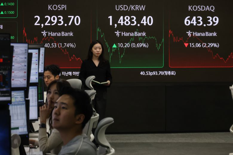 미국의 상호 관세 발효 이후 코스피 2,300선이 무너진 지난 9일 서울 중구 하나은행 본점 딜링룸에 원달러 환율 등 지수가 표시돼 있다. 성동훈 기자