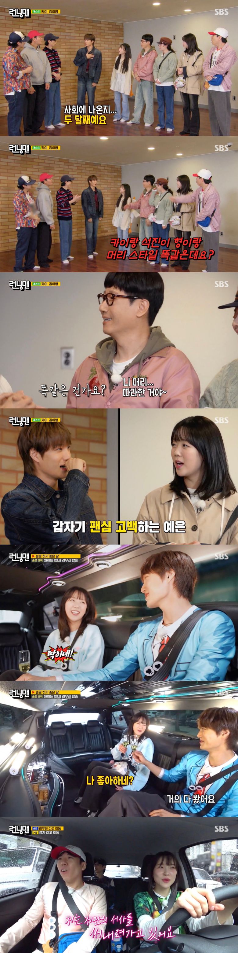 그는 "사회에 나온 지 두 달 째다. 그래서 지금 상황이 모두 신기하다"라고 말했다. 이를 보던 멤버들은 카이와 지석진의 헤어스타일이 똑같다고 지적했다.