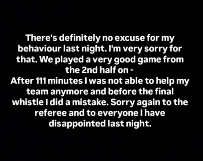 그는 "어젯밤 내 행동에 대해 변명의 여지가 없다"며 "후반부터 훌륭한 경기를 펼쳤음에도, 경기 종료 직전에 큰 실수를 저질렀다. 심판과 내 동료들, 팬들 모두에게 깊이 사과드린다"고 전했다.
