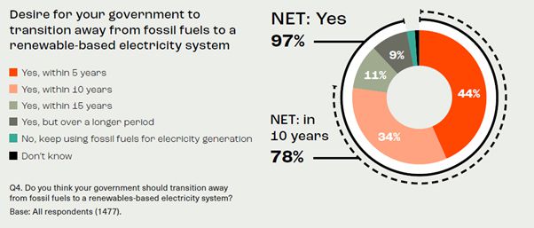 44%는 5년 내 재생에너지로의 전환을, 34%는 10년 내 전환을 지지한다고 답했다. 결과적으로 2035년까지 재생에너지 전환을 이뤄내야 한다는 응답률이 78%에 이르는 것이다.