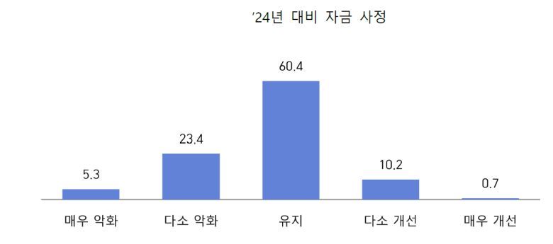 조사에 따르면 지난해와 비교한 올해 자금 사정은 '개선됐다'가 10.9%, '비슷하다'가 60.4%, '악화됐다'가 28.7%로 각각 나타났다.