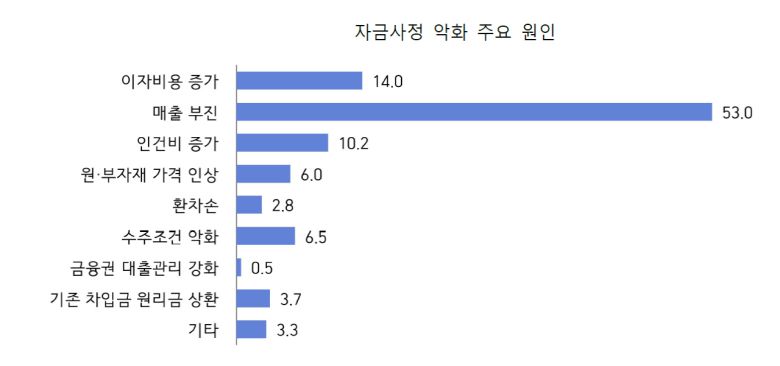 자금 사정 악화 요인으로는 절반이 넘는 53%가 '매출 부진'을 꼽은 가운데 ▲이자 비용 증가(14%) ▲인건비 증가(10.2%) ▲수주조건 악화(6.5%) 등을 지목했다.