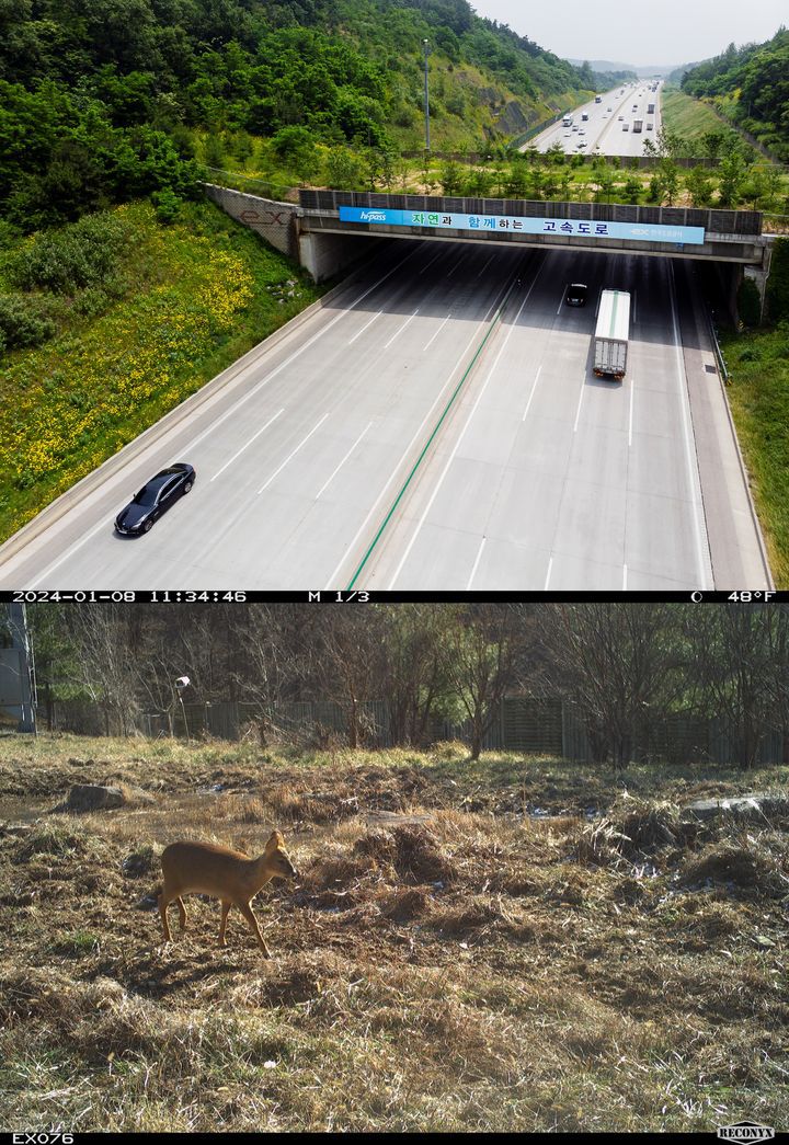 [서울=뉴시스] 호남고속도로의 육교형 생태통로(위)와 생태통로에서 포착된 고라니의 모습. 2025.04.28. (사진=한국도로공사 제공) photo@newsis.com *재판매 및 DB 금지 |