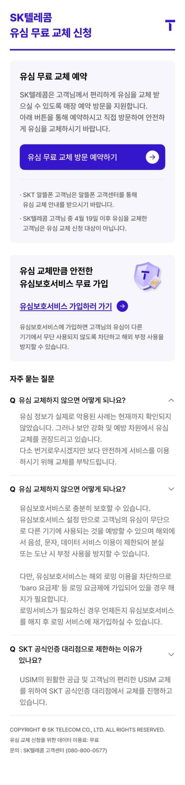 '유심 무료 교체 예약 시스템' 대기 화면은 불법 유심 복제 범죄 예방에 필수적인 '유심보호서비스' 가입 링크와도 연결돼, 아직 가입하지 않은 고객들이 편리하게 신청 페이지에 연결할 수 있도록 했다.